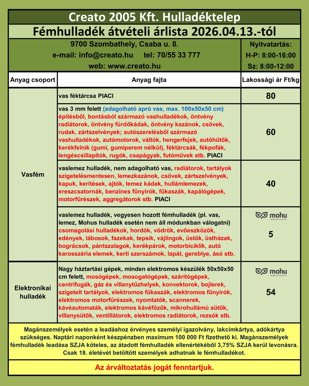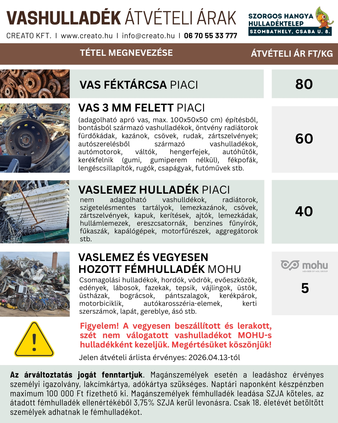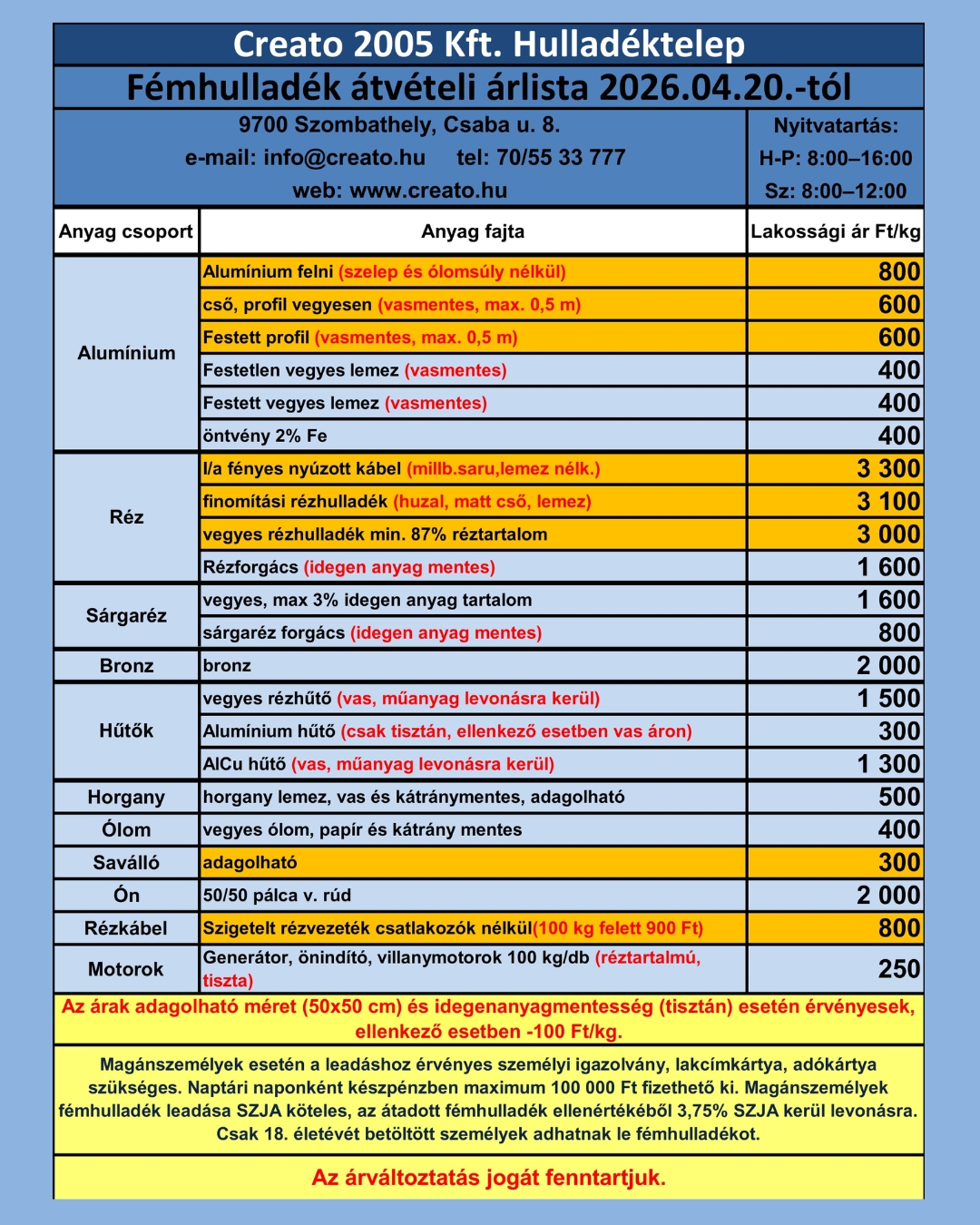 Piaci fémhulladék árlista